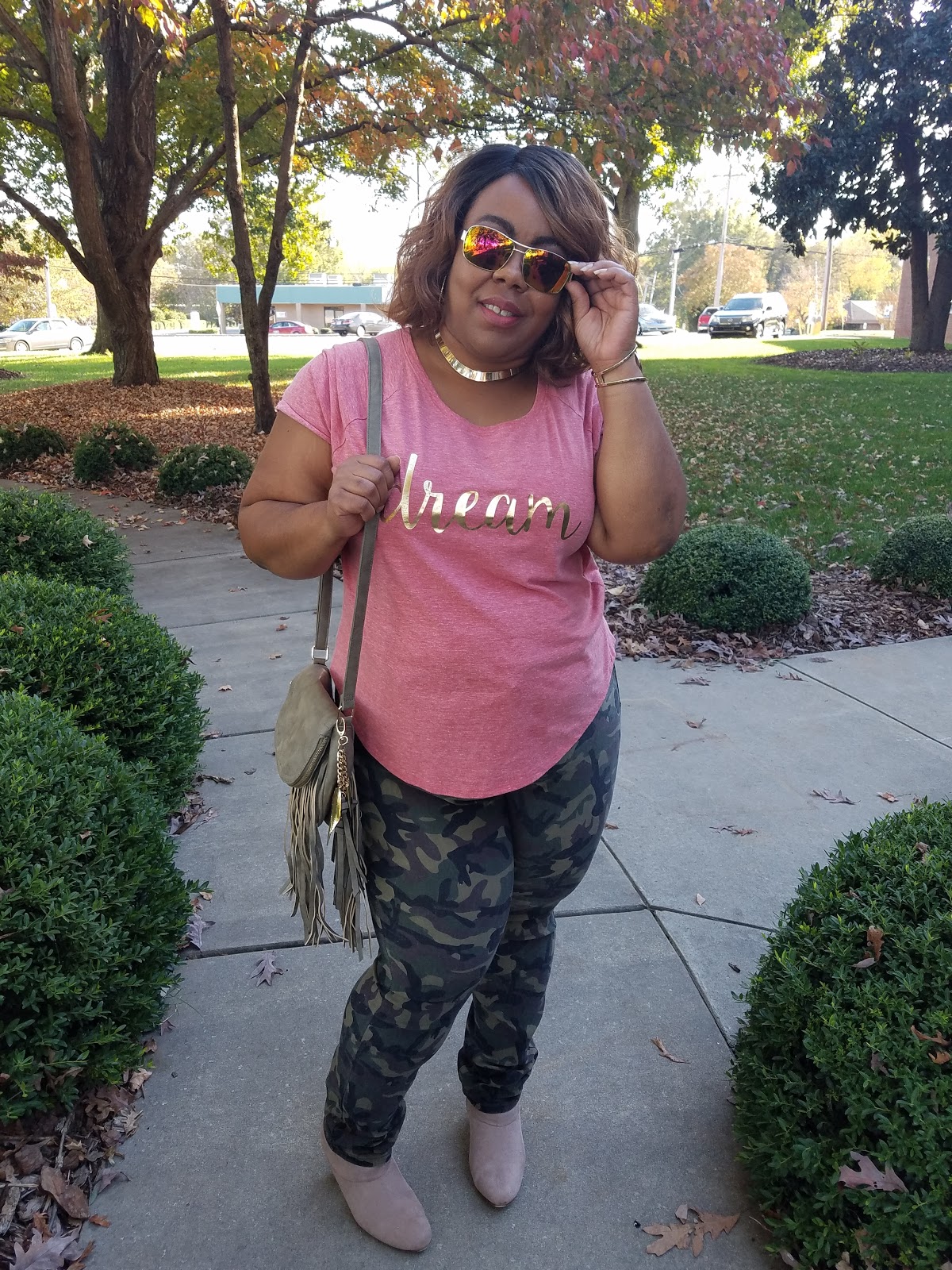 Dream tee: Purchased during the Dream Women's Conference at my church | Camouflage Pants: It's Fashion (I've had them a while) | Taupe Booties: Rack Room Shoes (purchased at end of winter season last year) | Fringe Purse: $10 (a new department store I found in my neighborhood Simply Fashion!) | Sunnies and choker (borrowed...lol)